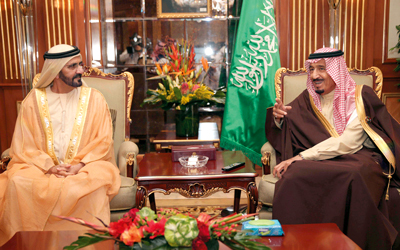 محمد بن راشد مع الأمير سلمان بن عبدالعزيز في قصر بيان بالكويت. وام