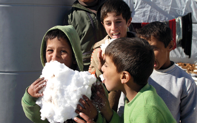 مجموعة من الأطفال السوريين النازحين في لبنان يمرحون بقطعة من الثلج المتساقط فوق مخيمهم. أ.ف.ب
