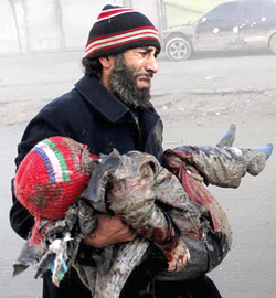 رجل يبكي وهو يحمل جثة طفل قتل في قصف نفذته القوات النظامية على مدينة حلب. أ.ب