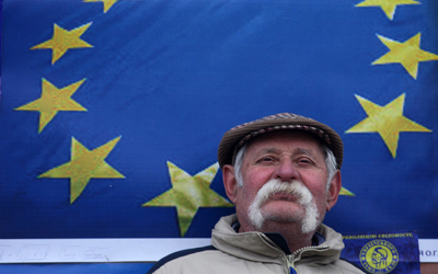 متظاهر أوكراني موالٍ لأوروبا بميدان الاستقلال في كييف. إي.بي.إيه