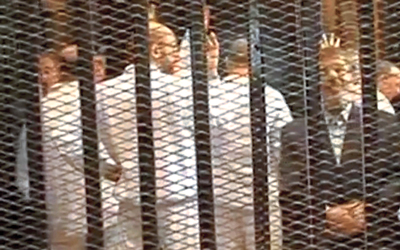 مرسي وعدد من قيادات «الجماعة» خلال جلسة محاكمة سابقة. إي.بي.إيه