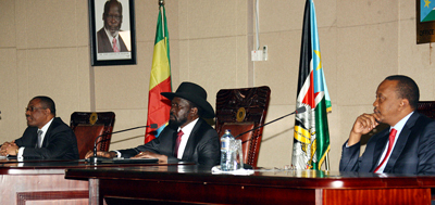 سلفاكير يتوسط الرئيس الكيني أوهورو كينياتا (يسار) ورئيس الوزراء الإثيوبي هايلي ميريام ديسيلين. أ.ف.ب