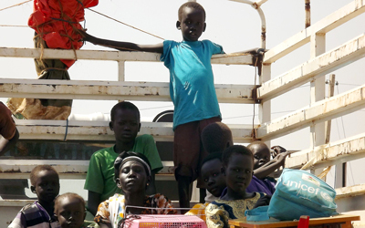 أطفال من ولاية جونقلي بجنوب السودان على شاحنة في طريقها إلى أوغندا هرباً من القتال. أ.ف.ب