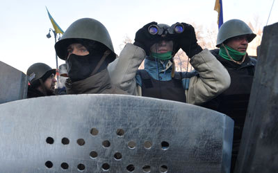 عناصر من المعارضة الأوكرانية في أحد الشوارع وسط كييف. أ.ف.ب