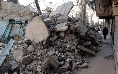 سوري يمر بجانب أكوام من الدمار نتيجة قصف قوات النظام. رويترز