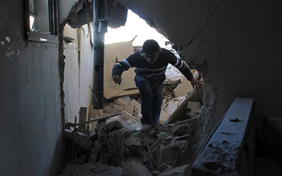 سوري يمرّ من داخل مبنى مدمر نتيجة قصف النظام على مدينة حلب. رويترز