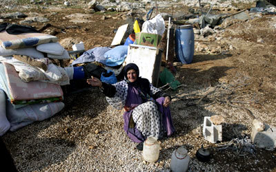 عجوز فلسطينية تجلس وسط أغراض بيتها الذي هدمته قوات الاحتلال في «الضفة». أ.ب