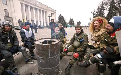 محتجون في حراسة البرلمان الأوكراني أمس. أي.بي.أيه