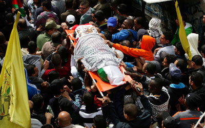 فلسطينيون يشيّعون رفات الشهيد سرحان في مخيم طولكرم. أ.ب