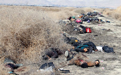 صورة بثتها «سانا» لما قالت إنها جثث عشرات من مقاتلي المعارضة قتلوا في الغوطة الشرقية. أ.ف.ب