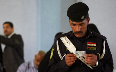 شرطي عراقي يتسلم بطاقته الانتخابية من مفوضية الانتخابات في النجف. أ.ف.ب