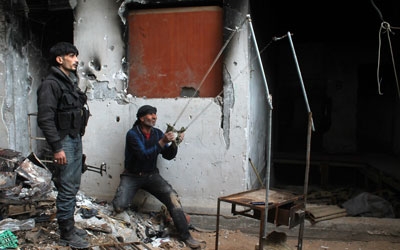 مقاتل من الجيش الحر يستخدم المقلاع في اشتباكات مع القوات النظامية بدير الزور. أ.ف.ب