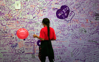 فتاة في كوالالمبور تقرأ رسائل موجّهة إلى مسافري الطائرة المفقودة. أ.ب