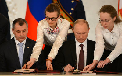 انضمت القرم إلى روسيا، إثر توقيع اتفاق، أمس، بين الرئيس الروسي فلاديمير بوتين، والقادة الجدد لشبه الجزيرة الواقعة في جنوب أوكرانيا، التي دعت المجموعة الدولية إلى عدم الاعتراف بـ«جمهورية القرم» الانفصالية، ولا بأي اتفاق يمكن ان تبرمه مع موسكو.