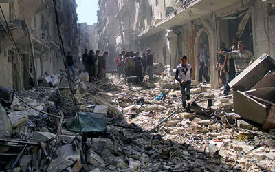 سوريون يقفون على حجم الدمار والخراب في حلب نتيجة قصف قوات النظام للمدينة. أ.ب
