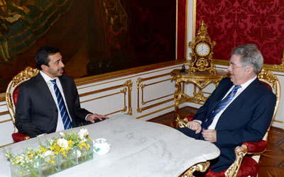 عبدالله بن زايد خلال محادثاته مع الرئيس النمساوي في فيينا. وام