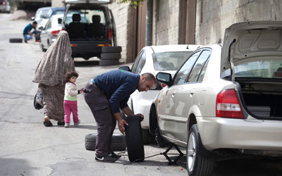 فلسطينيان في بيت حنينا بالقدس يصلحان إطاري سيارتهما بعد اعتداء متطرفين يهود. إي.بي.إيه