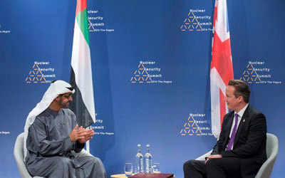 التقى الفريق أول سمو الشيخ محمد بن زايد آل نهيان، ولي عهد أبوظبي نائب القائد الأعلى للقوات المسلحة، أمس، رئيس الوزراء البريطاني ديفيد كاميرون، في لاهاي، حيث جرى خلال اللقاء بحث علاقات الصداقة والتعاون بين البلدين وسبل تعزيزها. وتناول الحديث أعمال القمة النووية، وأهمية بذل المزيد من التعاون، وبناء الثقة بين دول العالم من أجل الحد من انتشار الأسلحة النووية.