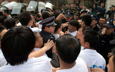 اشتبك عشرات من أقارب ركاب الطائرة الماليزية المفقودة، مع الشرطة الصينية أمام سفارة ماليزيا في بكين، أمس.