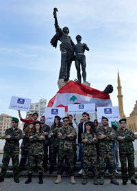 لبنانيون يرتدون الزيّ العسكري خلال تظاهرة في بيروت ضد تدخل «حزب الله» في سورية. إي.بي.إيه