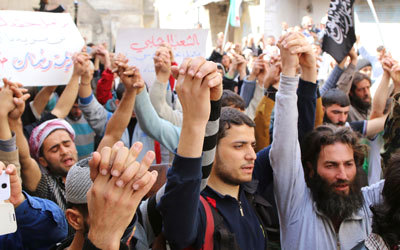 معارضون سوريون يشبكون أياديهم خلال تشييع رجل قُتل على يد قوات موالية للأسد في حي الكلاسة بحلب. رويترز