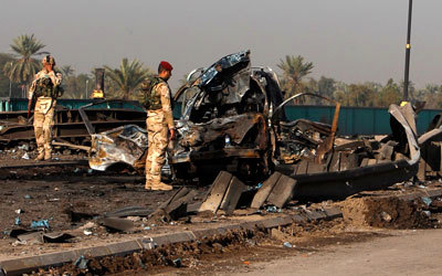 عناصر من الأمن العراقي عند موقع تعرض للتفجير شمال بغداد. رويترز