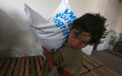 صبي سوري يحمل كيساً من المساعدات الإنسانية في بلدة دوما. رويترز