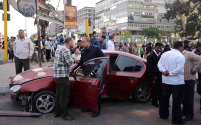 مصريون أمام موقع تفجير استهدف سيارة ضابط شرطة في القاهرة. أ.ف.ب
