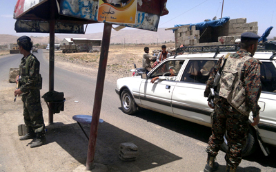 جنديان يمنيان يراقبان أحد الشوارع في مدينة عرمان شمال صنعاء. أ.ف.ب