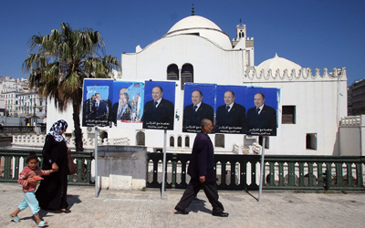 جزائريون يسيرون بجوار ملصقات انتخابية لبوتفليقة في العاصمة. إي.بي.إيه
