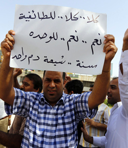 عراقيون خلال تظاهرة ضد الطائفية وتأييداً لوحدة العراق. إي.بي.إيه