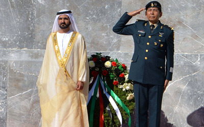 وضع صاحب السمو الشيخ محمد بن راشد آل مكتوم، نائب رئيس الدولة رئيس مجلس الوزراء حاكم دبي، إكليلاً من الزهور على النصب التذكاري للطلاب الأبطال الذين سقطوا ضحايا معركة «تشابول تيبيك» الشهيرة، التي دارت رحاها في عام 1847 بين المكسيك والولايات المتحدة الأميركية، وذهب ضحيتها مئات الطلاب والأطفال المكسيكيين. ولدى وصول سموه، والوفد المرافق، إلى موقع النصب التذكاري، جرت لسموه مراسم الاستقبال المعتادة، حيث استعرض ثلة من حرس الشرف، ثم عزفت الموسيقى السلامين الوطنيين لدولة الإمارات العربية المتحدة والولايات المتحدة المكسيكية، تخللها إطلاق الأعيرة النارية، بعدها قام سموه بوضع إكليل من الزهور على النصب وسط عزف الموسيقى الجنائزية. ووُدّع سموه بمثل ما استقبل به من حفاوة واهتمام.