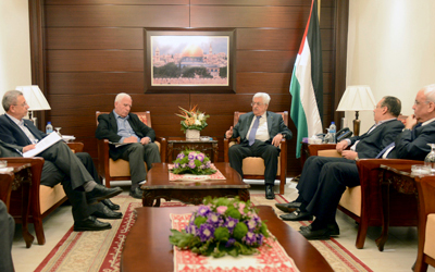 عباس يجتمع بوفد «منظمة التحرير» قبيل ذهابه إلى غزة. أ.ف.ب