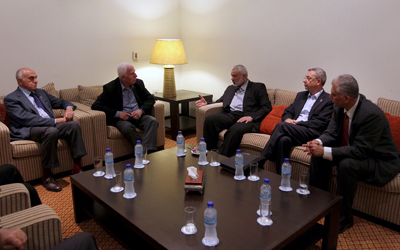 إسماعيل هنية يتحدث إلى رئيس وفد «فتح» عزام الأحمد (الثاني من اليسار) إلى جانب مصطفى البرغوثي وآخرين في غزة غداة الاتفاق. أ.ف.ب