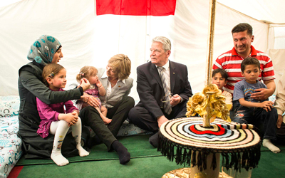زار الرئيس الألماني يواخيم جاوك مخيماً للاجئين السوريين في كهرمان مرعش بتركيا أمس، حيث استمع إلى إفادات عن أوضاع اللاجئين في الوقت الراهن قبل أن يلتقي وقرينته دانيلا شات إحدى الأسر التي تعيش في المخيم. وتقول السلطات التركية إن أكثر من 200 ألف لاجئ سوري يعيشون حالياً في مخيمات للاجئين في البلاد 15 ألفاً منهم يعيشون في كهرمان مرعش.