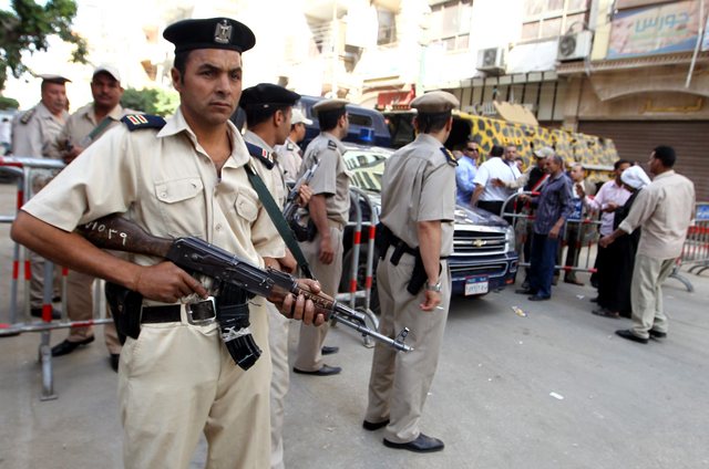 قوات الشرطة المصرية خلال تأمين مقر محاكمة عناصر الإخوان في المنيا. إي.بي.إيه