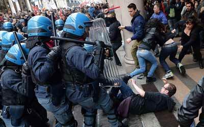 الشرطة تشتبك مع المتظاهرين في شمال إيطاليا خلال مسيرات عيد العمال. إي.بي.إيه
