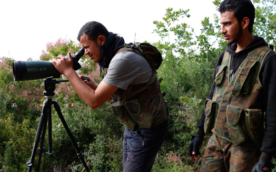 مقاتل من الجيش الحرّ يراقب القوات النظامية بواسطة تليسكوب من منطقة جبل الأكراد بريف اللاذقية. رويترز