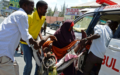 صوماليون ينقلون ضحايا التفجير إلى سيارة إسعاف. أ.ف.ب