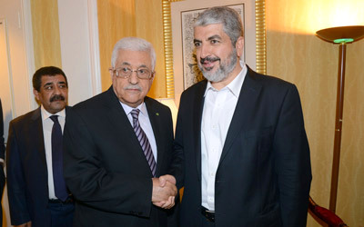 بحث الرئيس الفلسطيني محمود عباس، أمس، مع رئيس المكتب السياسي لحركة المقاومة الإسلامية «حماس»، خالد مشعل، اتفاق المصالحة الوطنية، وتكريس الأجواء الإيجابية، في أول لقاء يجمع بينهما منذ التوصل إلى اتفاق المصالحة الفلسطينية. في حين أبدت «حماس» استعدادها لدعم عباس للصمود في وجه الضغوط الأميركية والإسرائيلية.
