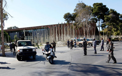 عناصر من الحرس الليبي أمام مبنى البرلمان في طرابلس بعد تسمية رئيس الوزراء الجديد. رويترز