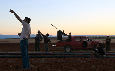 مقاتلون من «الجيش الحر» يشيرون إلى زميلهم على مدفع مضاد للطائرات في ريف إدلب لاستهداف طائرة للقوات النظامية. رويترز