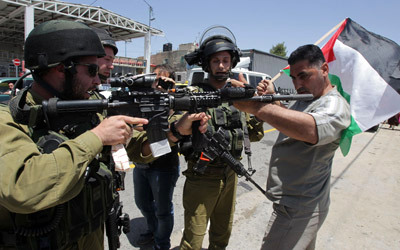 فلسطيني يبعد بندقية جندي إسرائيلي عن وجهه خلال تظاهرة لدعم الأسرى في شارع 60 بين القدس والخليل. أ.ف.ب