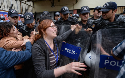 الشرطة التركية تشتبك مع محامين قبل اعتقالهم بعد الاحتجاج على كارثة المنجم. أ.ب