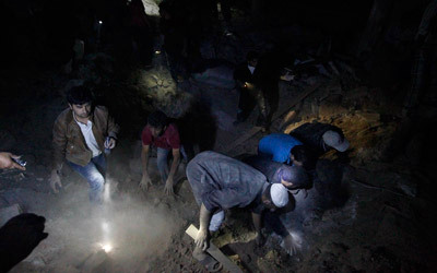 رجال يبحثون عن ناجين تحت أنقاض منازل انهارت بصاروخ أطلقته القوات النظامية على بلدة مارع في ريف حلب. رويترز