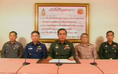 أعلن قائد الجيش التايلاندي، الجنرال برايوت تشان أوتشا، أمس، عبر التلفزيون، الاستيلاء على السلطة، بعد سبعة أشهر من الأزمة السياسية، وشدد على أن ما جرى لن يؤثر في العلاقات الدولية لبلاده، وأشار إلى أن الانقلاب يهدف إلى استعادة الاستقرار وتحقيق الإصلاح السياسي في البلاد. وقرر الجنرال برايوت فرض الأحكام العرفية لمنع وقوع مزيد من العنف، ووضع قيوداً على وسائل الإعلام، ومن بينها قنوات التلفزيون المؤيدة لأحزاب سياسية، وحذر الشعب من نشر مواد تحريضية على وسائل التواصل الاجتماعي على الإنترنت.