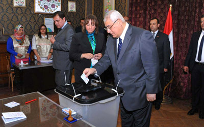 الرئيس المصري المؤقت عدلي منصور خلال الإدلاء بصوته أمس. أ.ب