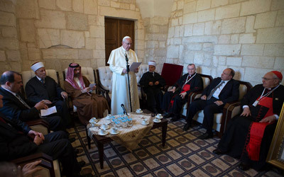 وقال في لقاء مع مفتي القدس والديار الفلسطينية الشيخ محمد حسين، «لنحترم ونحب بعضنا بعضاً كأخوة وأخوات، لنتعلم ان نفهم ألم الآخر ولا يستغلنّ احد اسم الله لممارسة العنف، ولنعمل معاً من اجل العدالة ومن أجل السلام».