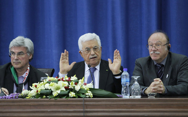 عباس يتحدث أمام نشطاء فرنسيين متضامنين مع الفلسطينيين خلال زيارتهم إلى رام الله. أ.ف.ب