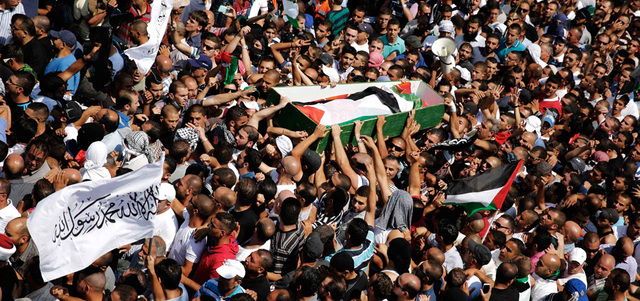 آلاف المشيعين في جنازة محمد أبوخضير (16 عاماً) في شعفاط بالقدس الشرقية أمس. رويترز